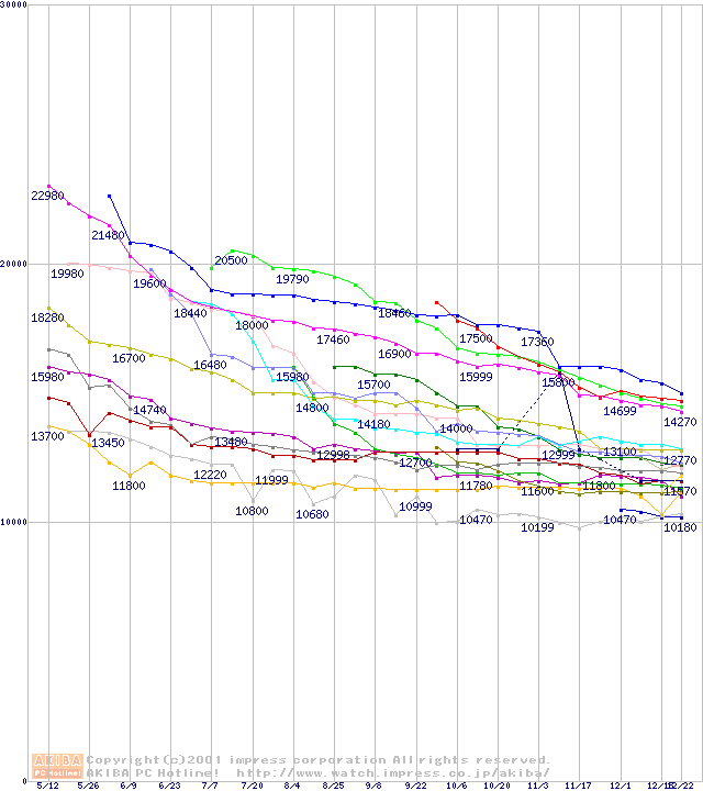 HDD主要製品(最安値1万5千円~2万円未満)の最安値推移