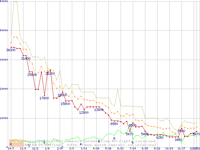 PC100 SDRAM DIMM CasLatency=2 ECC対応の最安値推移