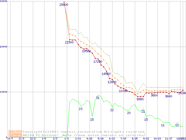 Socket A (Thunderbird,PGA,FSB 266MHz,L2 256KB)の最安値推移