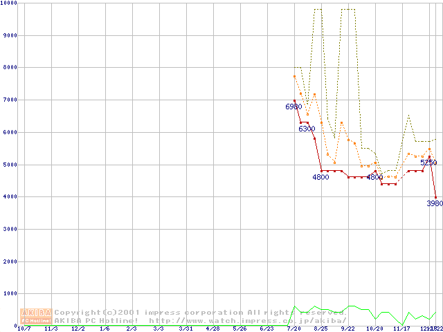 PC100 SDRAM DIMM CasLatency=2 ECC対応 Registeredタイプの最安値推移