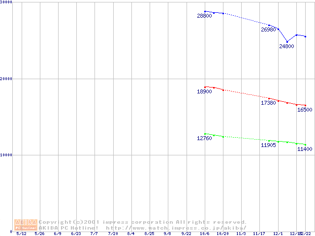 | [↑前グラフ]: | Travelstar 20GN (9.5mm,4200rpm,UltraATA/66,2MB/512KB/256KB)の最安値推移 |