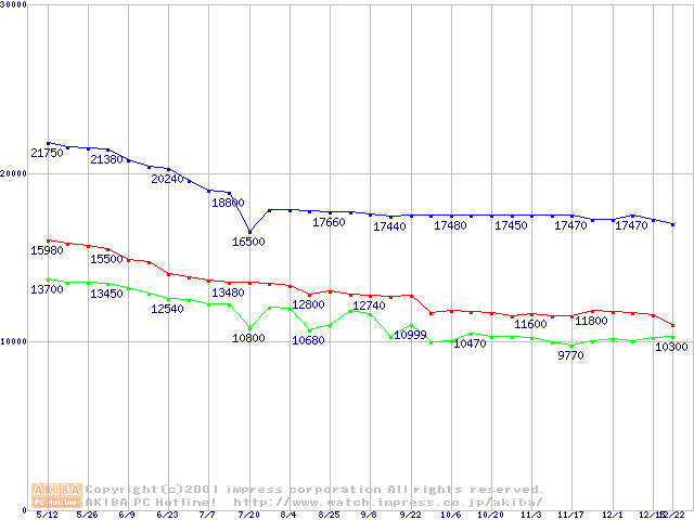 | [↑前グラフ]: | DiamondMax Plus D740X (7200rpm,UltraATA/133,40GB/Platter)の最安値推移 |