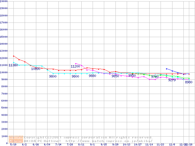 | [↑前グラフ]: | HDD 10GB~20GB未満(7200rpmクラス)の最安値推移 |