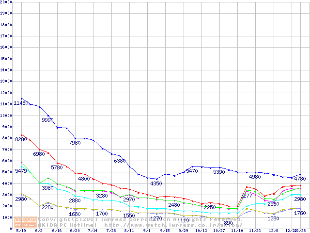 メモリ主要製品(最安値5千円~1万円未満)の最安値推移