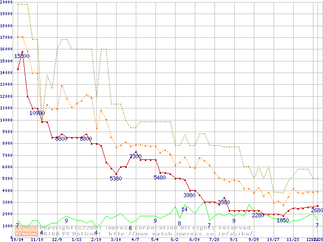 PC100 SDRAM DIMM CasLatency=2 ECC対応の最安値推移