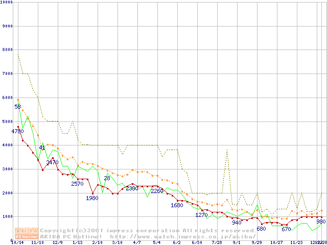 PC100 SDRAM DIMM CasLatency=2の最安値推移