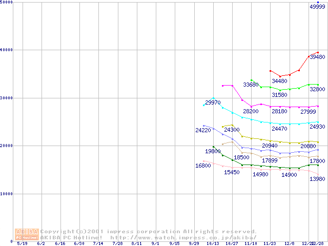 Socket A (Palomino,OPGA,FSB 266MHz,L2 256KB)の最安値推移