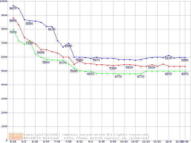 | [↑前グラフ]: | Socket 370 (FC-PGA,FSB 100MHz,L2 128KB)の最安値推移 |