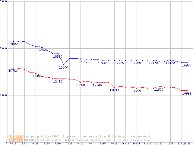 | [↓次グラフ]: | DiamondMax D540X (5400rpm,UltraATA/133,40GB/Platter)の最安値推移 |