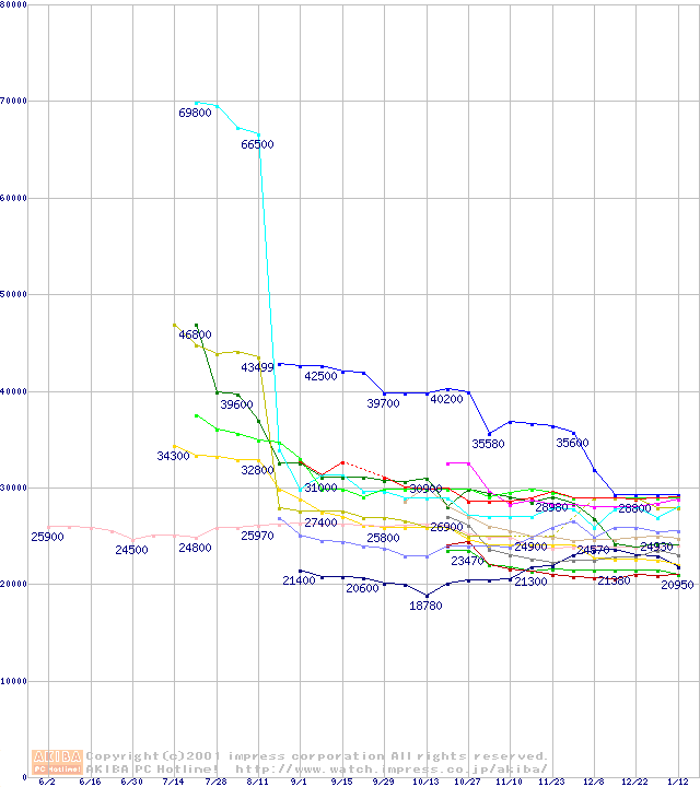 CPU主要製品(最安値1万円~2万円未満)の最安値推移