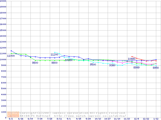 | [↑前グラフ]: | HDD 10GB~20GB未満(7200rpmクラス)の最安値推移 |