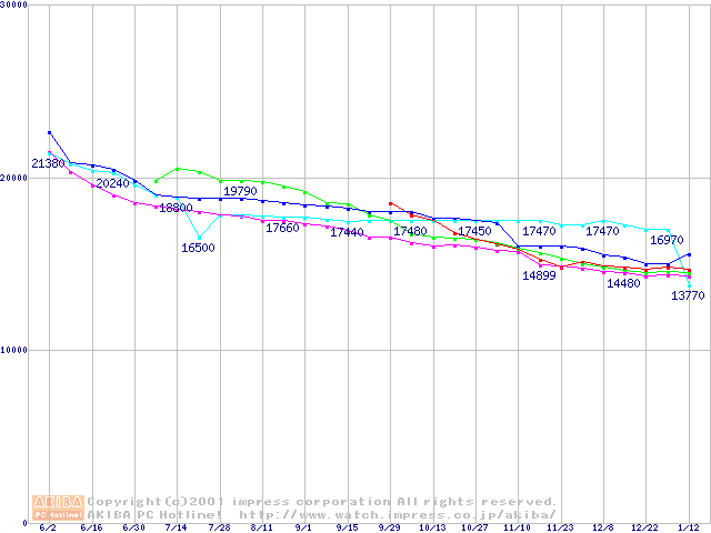 | [↑前グラフ]: | HDD 40GB~50GB未満(7200rpmクラス)の最安値推移 |