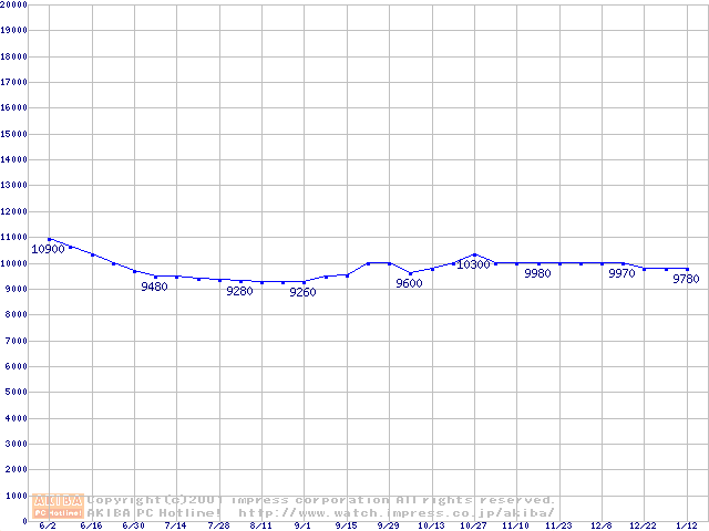 | [↑前グラフ]: | HDD 20GB~30GB未満(5400rpmクラス)の最安値推移 |