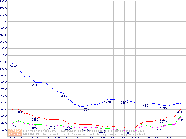 メモリ主要製品(最安値5千円未満)の最安値推移