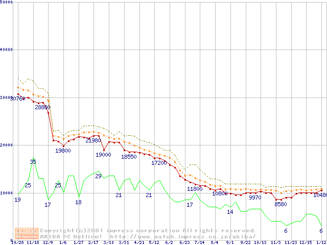 Socket A (Thunderbird,PGA,FSB 200MHz,L2 256KB)の最安値推移