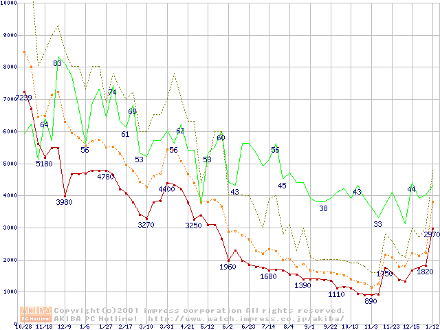 PC100 SDRAM DIMM CasLatency=2の最安値推移