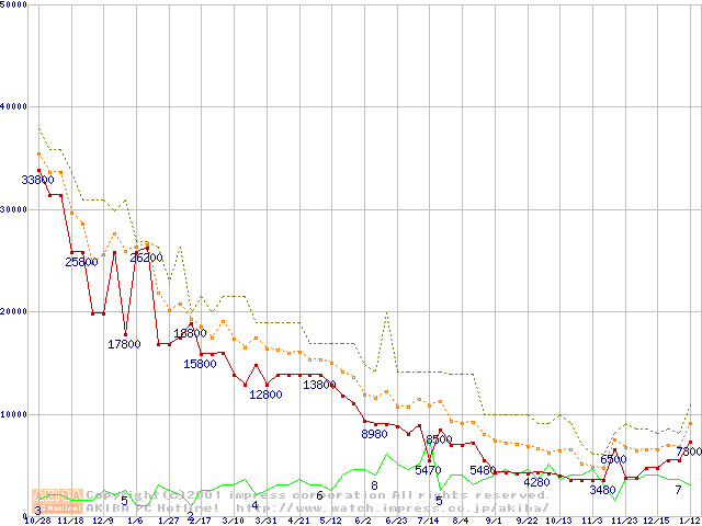 PC100 SDRAM DIMM CasLatency=2 ECC対応の最安値推移