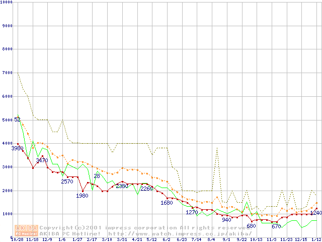 PC100 SDRAM DIMM CasLatency=2の最安値推移