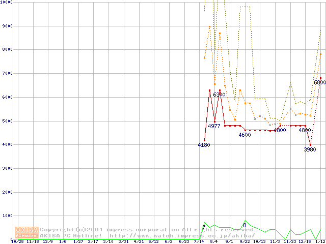 PC133 SDRAM DIMM CasLatency=3 ECC対応 Registeredタイプの最安値推移
