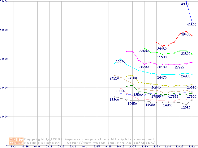 Socket A (Palomino,OPGA,FSB 266MHz,L2 256KB)の最安値推移