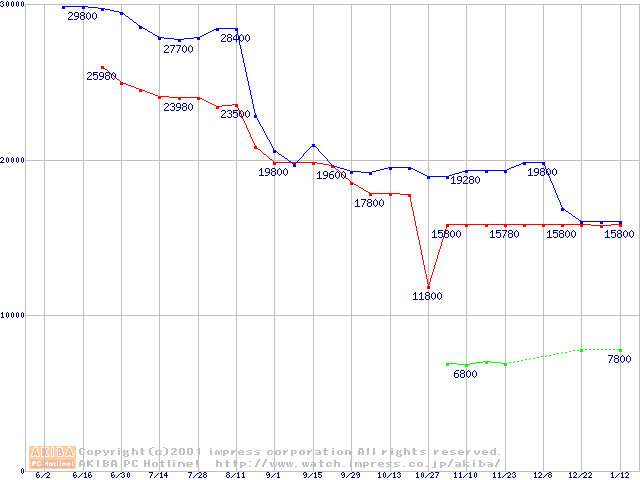 | [↑前グラフ]: | Socket A (Palomino,OPGA,FSB 266MHz,L2 256KB)の最安値推移 |