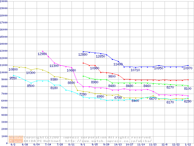 | [↑前グラフ]: | Socket 370 (FC-PGA2,FSB 100MHz,L2 256KB)の最安値推移 |