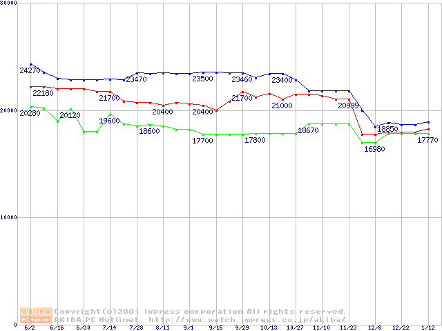 | [↑前グラフ]: | Socket 370 (FC-PGA2,FSB 133MHz,L2 256KB)の最安値推移 |