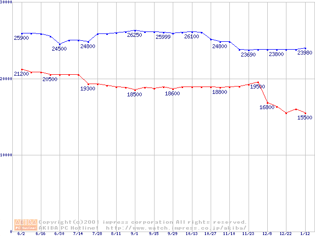 | [↑前グラフ]: | Slot 1 (SECC2,FSB 133MHz,L2 256KB)の最安値推移 |