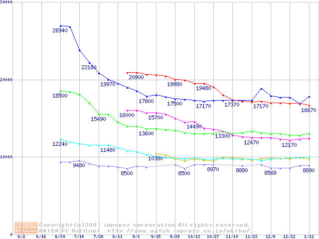 | [↓次グラフ]: | DiamondMax 536DX (5400rpm,UltraATA/100,33.3GB/Platter)の最安値推移 |