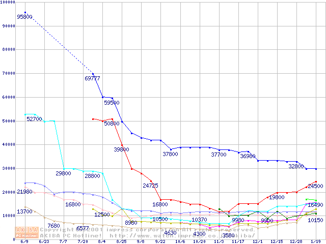 メモリ主要製品(最安値1万円以上)の最安値推移