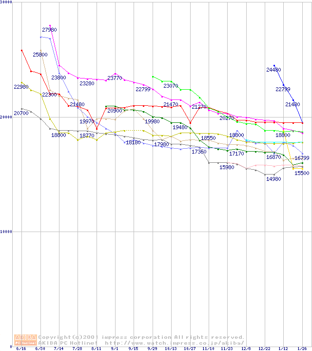 HDD主要製品(最安値2万円以上)の最安値推移