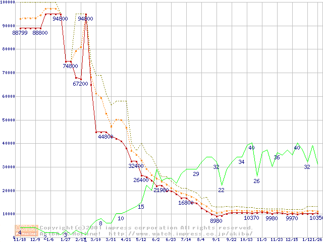 メモリ主要製品(最安値1万円以上)の最安値推移