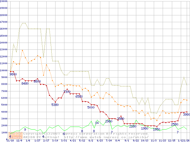 PC100 SDRAM DIMM CasLatency=2 ECC対応の最安値推移