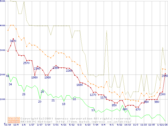 PC100 SDRAM DIMM CasLatency=2の最安値推移