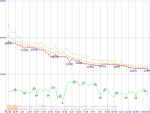 WD Caviar (7200rpm,UltraATA/100,20GB/Platter)の最安値推移
