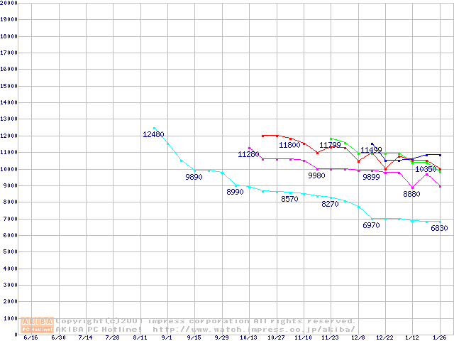 | [↓次グラフ]: | Socket A (Spitfire,PGA,FSB 200MHz,L2 64KB)の最安値推移 |