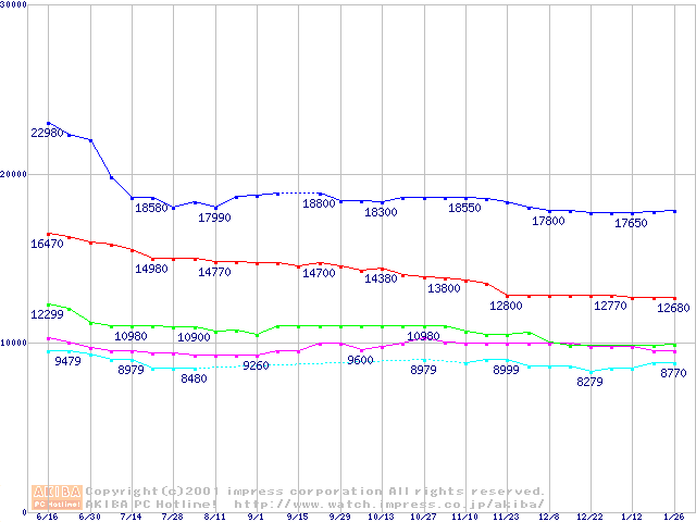 | [↑前グラフ]: | WD Caviar (7200rpm,UltraATA/100,20GB/Platter)の最安値推移 |