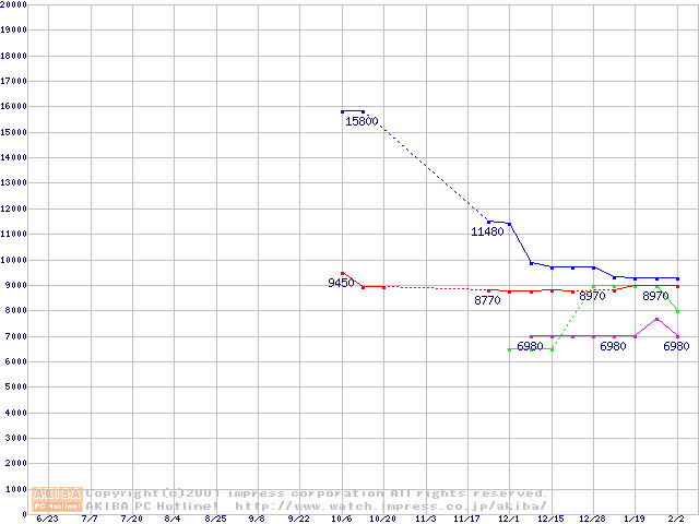 | [↓次グラフ]: | 2.5インチHDD主要製品(最安値1万円~1万5千円未満)の最安値推移 |