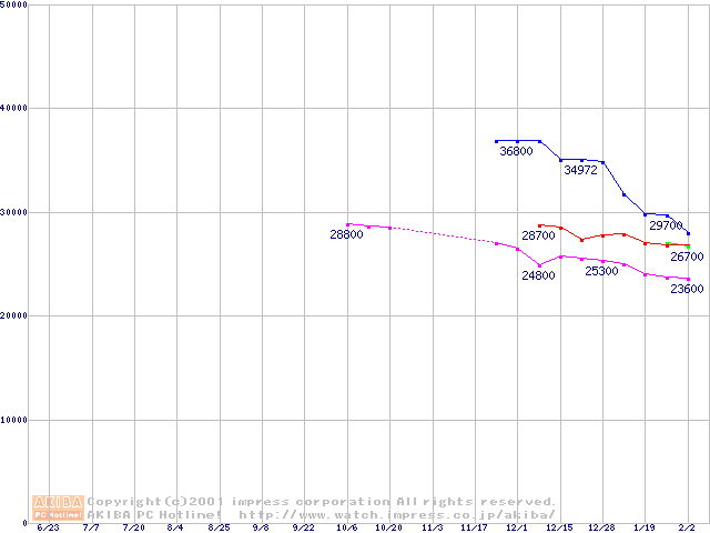 | [↑前グラフ]: | 2.5インチHDD 30GB~40GB未満(9.5mm厚)の最安値推移 |