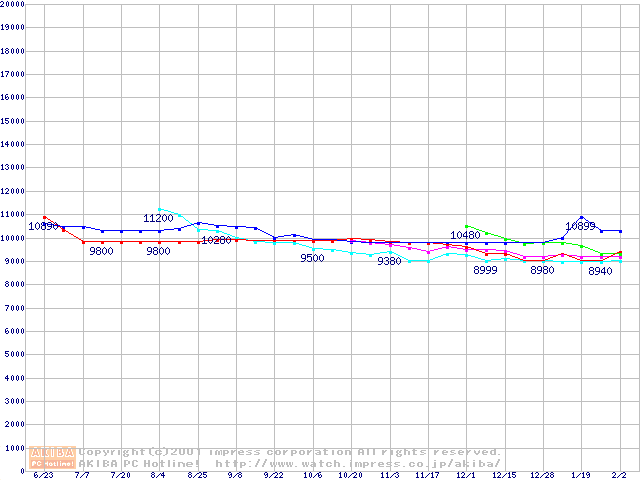 | [↑前グラフ]: | HDD 10GB~20GB未満(7200rpmクラス)の最安値推移 |