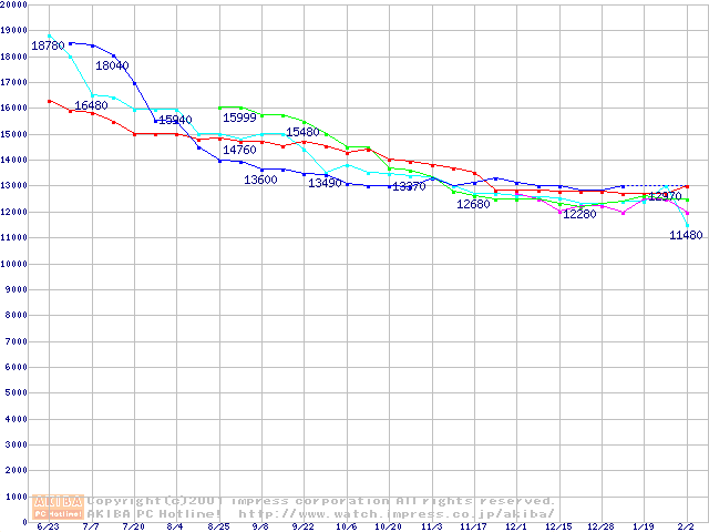 | [↑前グラフ]: | HDD 40GB~50GB未満(5400rpmクラス)の最安値推移 |