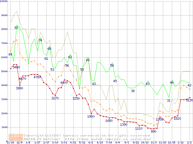 PC100 SDRAM DIMM CasLatency=2の最安値推移