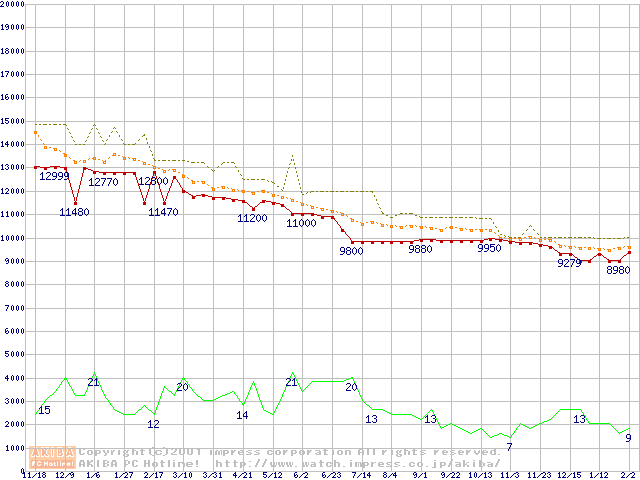 WD Caviar (7200rpm,UltraATA/100,20GB/Platter)の最安値推移