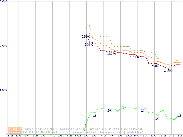 HDD主要製品(最安値1万5千円~2万円未満)の最安値推移