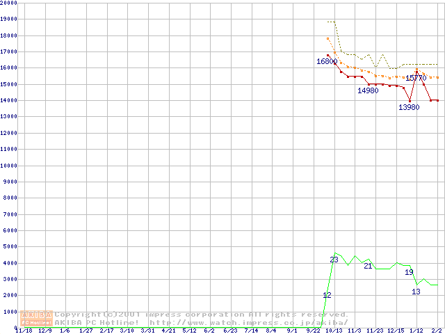 Socket A (Palomino,OPGA,FSB 266MHz,L2 256KB)の最安値推移