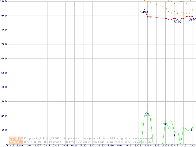 Travelstar 20GN (9.5mm,4200rpm,UltraATA/66,2MB/512KB/256KB)の最安値推移