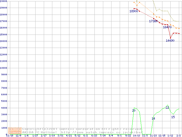 2.5インチHDD主要製品(最安値1万5千円~2万円未満)の最安値推移