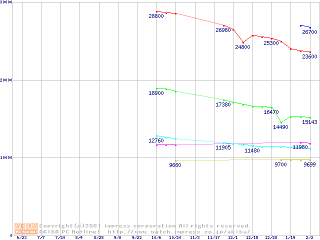 | [↑前グラフ]: | Travelstar 12GN (9.5mm,4200rpm,UltraATA/66,512KB)の最安値推移 |
