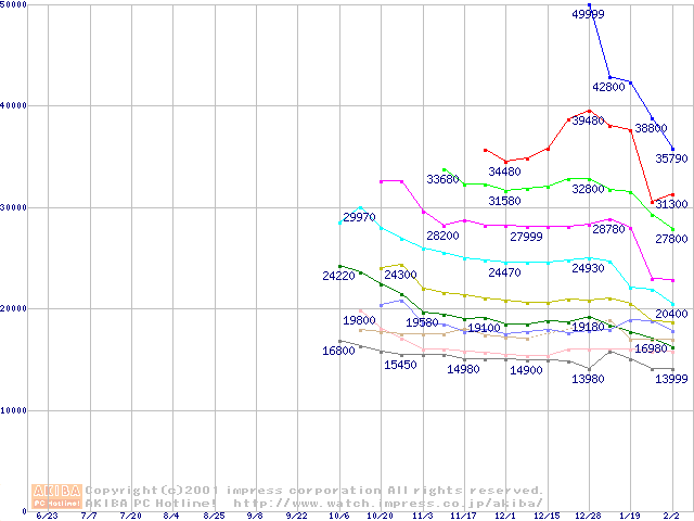 Socket A (Palomino,OPGA,FSB 266MHz,L2 256KB)の最安値推移