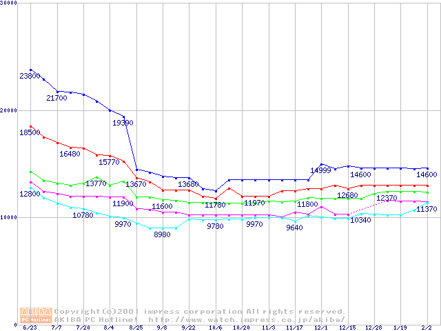 | [↑前グラフ]: | Socket A (Palomino,PGA,FSB 266MHz,L2 256KB)の最安値推移 |
